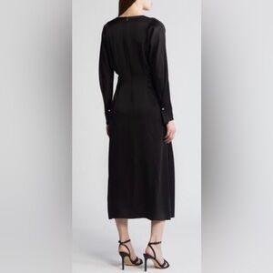 Sophisticated black dress with long sleeves. V-Neck & Fluted, Silver Button Down Cuffs. Features a sleek silhouette. Ideal for formal events & holiday parties. Pristine, giftable!