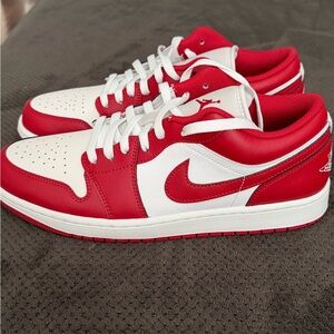 Classic Air Jordan 1 Low in summit white and varsity red. Iconic design with a sleek look. New with box