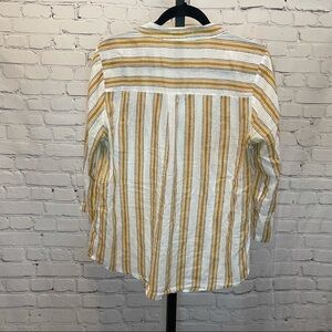 Light weight cream and yellow vertical striped blouse, 3/4 sleeves and V neckline