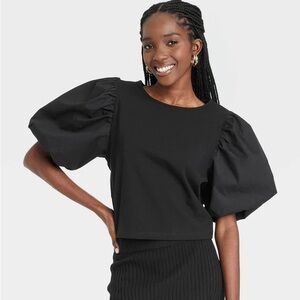 Chic black blouse with puff sleeves. Perfect for versatile styling. See last image for material specifications. Women’s Small.