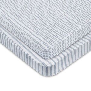 Elys & Co waterproof Pack n Play / mini crib sheet set – 2 pack. All-in-one fitted sheet and mattress protector made from soft jersey cotton with a waterproof backing. Designed for playards and mini cribs with a snug, secure fit.