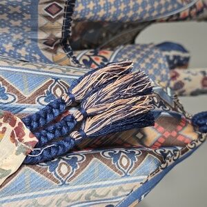 Four sets of three braided tassels on hems.