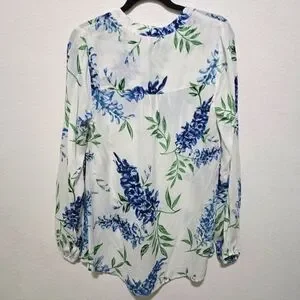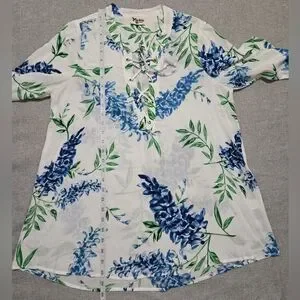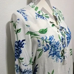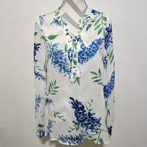 Boho style thatcher tie top in white with blue wisteria and green leaves. The tunic blouse has long sleeves and elastic cuffs. It also has a lace-up detail with tassels in front neckline. The fabric is light and slightly see-through.