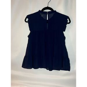 Keywords: Monteau Los Angeles, women's top, medium, tiered top, flutter sleeve, blue dress, casual top, spring fashion, polyester dress, round neck, keyhole back, pullover top, pre-owned, Vietnam.