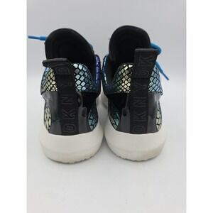 The DKNY women's black lynzie snake print lace-up sneakers in size 8.5 are a stylish and versatile athletic shoe designed for various occasions such as activewear, casual outings, and workwear. These sneakers feature a trendy lace-up closure, a colorful animal print design with signature DKNY logo accents, and a comfortable foam insole for added cushioning. Made with lightweight and durable materials, these sneakers offer both performance and style, making them ideal for activities like gym workouts, running, tennis, and more. The low-top shoe shaft style and rubber outsole provide great support for all-day wear in any season.