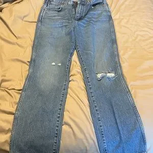 Classic straight leg jeans with a trendy distressed design. Ideal for everyday style.
