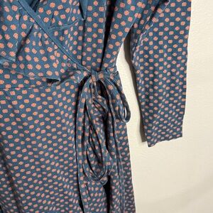 Beautiful Matilda Jane true wrap dress in a soft cotton/spandex knit. Long sleeves with a flattering V-neckline and feminine ruffle details. Features a blue/green background with a warm rust floral print. High-low hem adds movement and coverage, with the back falling longer than the front.