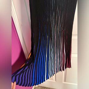 Kenzo Paris knit skirt, ribbed-black with different colors that peek out when moving. Pink/yellow/orange in front-blues in the back. The size tag is gone, but the waist measures 28 inches, length is 37 inches. (See last pic for conversion to women’s sizes). Purchased from The Real Real, still with authenticity tag attached. Elastic waist. MIDI/maxi length. Great quality!!