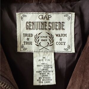 Vintage dark brown suede jacket from GAP kids. Size Medium but can fit women’s xxs-xs. Measurements are included in the photos. Some minimal signs of wear under one armpit and on the back of the collar shown in photos, cannot be seen when wearing. Minimal discoloration as expected with older suede. Lots of life left in this awesome jacket!