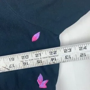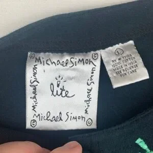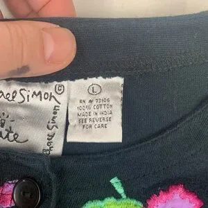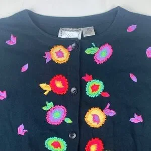 Michael Simon Lite in size large, black cardigan with vibrant floral embroidery. Good used condition. Button up front. Features multicolored flowers and leaves.