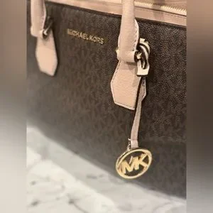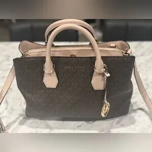 Elegant Michael Kors satchel in dark brown with cream accents. Features signature logo pattern. Ideal for everyday use. Brand new. Never used. Ordered online, no longer sold in stores. No call outs.