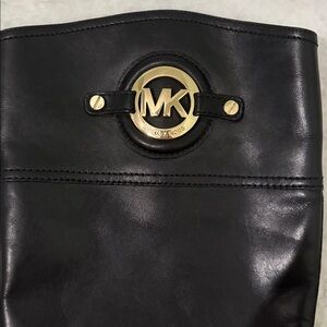 Chic black over the knee boots by Michael Kors. Features stylish gold accents. Perfect for elevating any outfit.