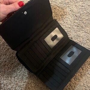 Elegant black wallet with intricate silver embroidery. Features floral patterns and decorative buckle. Stylish and functional design.