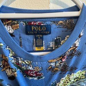 Vibrant blue graphic t-shirt by Polo Ralph Lauren. Features playful illustrations for a unique look.