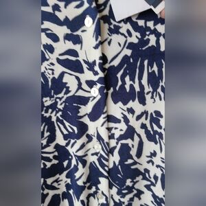 Stylish floral blouse with navy and white pattern. Features a bright yellow neckline. Perfect for casual or formal wear.