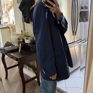 Stylish navy blazer featuring gold buttons. Perfect for a polished look.