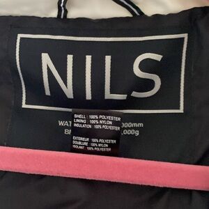 Stylish NILS ski jacket. Features a quilted design. Includes multiple zippered pockets. Perfect for winter sports or cold weather.