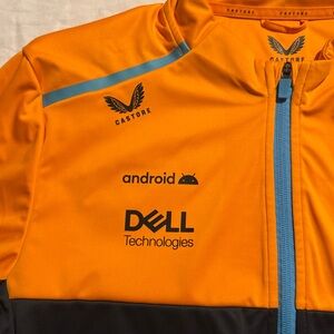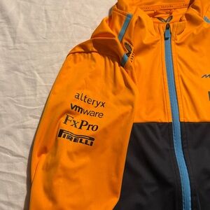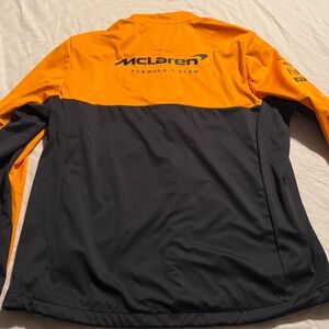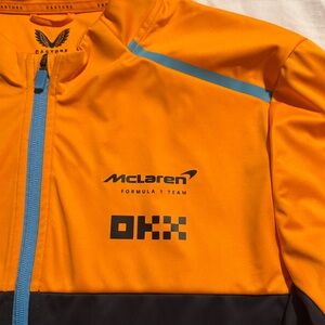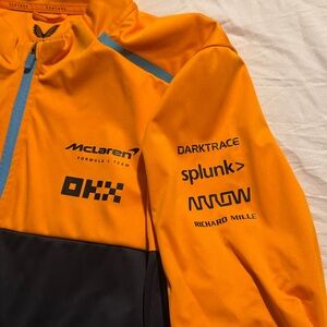 McLaren F1 Team jacket featuring a vibrant orange and black design. Perfect for racing enthusiasts. Amazing material feels good and luxurious! The baby blue adds a crazy good look to it! True to size