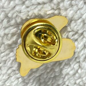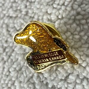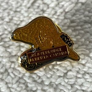 Gold pin featuring Beaver Lodge Alberta Canada. Unique design with intricate details.