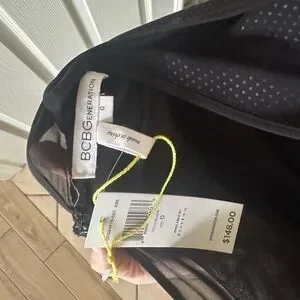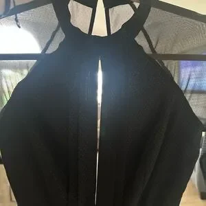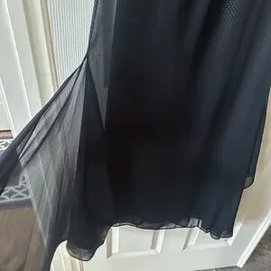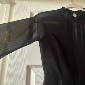 New with tags! Long sleeved good. Front slit on chest. Small polka dot fabric. Black on black. Sheer shoulders and sleeves. Open back. Perfect condition