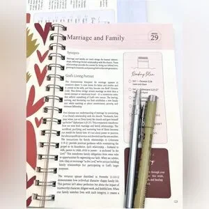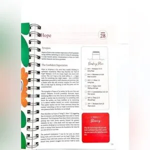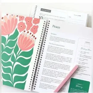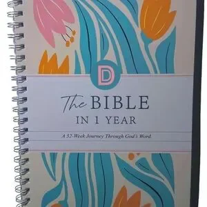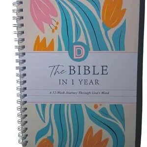 beautifully designed Bible in a Year journal with floral patterns. Features pink, yellow, and green colors. Book is thing flimsy pages not hard cover