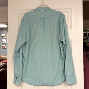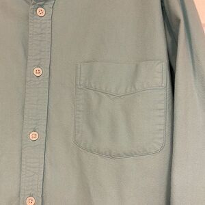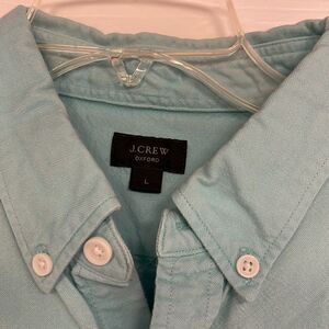 J Crew button down cotton shirt, men’s large, light blue, good used condition. Picture shows small lighter spot on the back of the shirt.