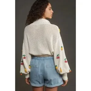 Farm Rio Sweater, Fruit Crochet, 3D Fruit, Banana Sweater, Cherry Sweater, Pointelle Knit, Balloon Sleeve, Farm Rio Small, Cotton Polo Sweater, Anthropologie Style, Tropical Chic, Colorful Knitwear.
