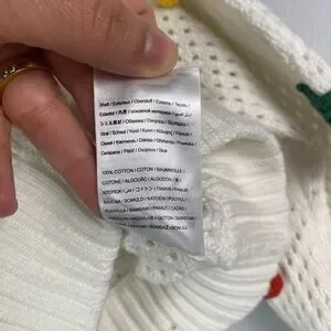 Product Details: Brighten up your wardrobe with this iconic Farm Rio "Fruit Salad" sweater. This isn't just a knit; it's a wearable piece of art! Featuring a breezy, off-white pointelle open-knit body, this sweater is adorned with hand-crocheted 3D fruit charms including cherries, bananas, pineapples, and oranges.