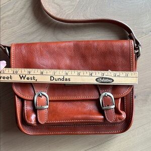 Elevate your style with this elegant tan leather messenger bag with brass hardware