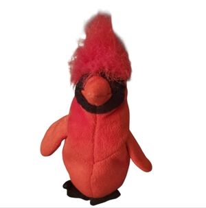 It is a bright red cardinal bird with brown and black button eyes. It has a tuft of bright red fur on top of its head and a black face and feet. Retired - missing original tag.