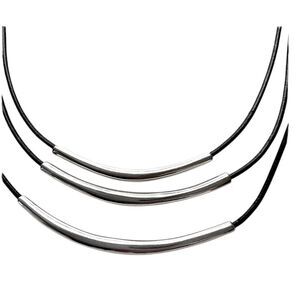 Three bars of .925 sterling silver shimmer against the black leather cord necklace. 16” long with 2” extender, lobster clasp. Very good pre-owned condition.