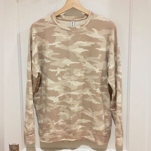 Athleta Studio sweatshirt features a unique camouflage pattern, perfect for an activewear or workouts outfit. The pullover style has a crew neck and long sleeves, made with a comfortable blend of Tencel, cotton, Lenzing Modal, and spandex materials. It is machine washable and has easy care features, ideal for winter, fall, and spring seasons. The loose fit is perfect for a regular size type and is part of the Athleta Studio product line. The multicolor sweatshirt is suitable for women and has a pullover closure.