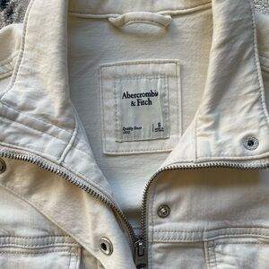 Stylish cream jean jacket by Abercrombie & Fitch. Modern cropped length with a relaxed, drop-shoulder design.