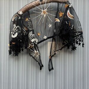 Chic black wrap with gold star details. Sheer and stylish. Ideal for evening wear or a festival!