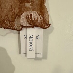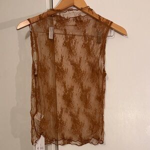 Elegant sheer lace top in a rich brown color. Sleeveless top in a thin lace material. Top is in size Medium with tags attached. This is a great free people dupe!