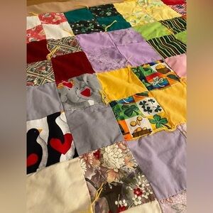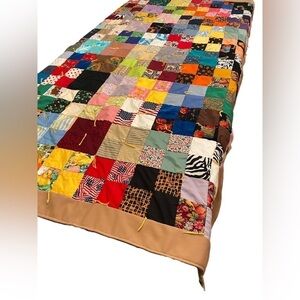 Patchwork Tied Cottagecore Grannycore Handmade Quilt w/a Winter Blue Snowman Scene on Backside Beautiful tan trim all around the patchwork side! Very well made. Preowned.