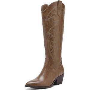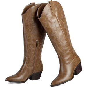 Women's Brown Cowboy Boots Wide Calf Knee High With Zip Classic Chunky Heel