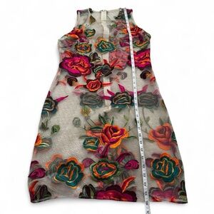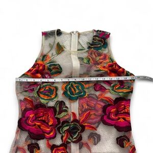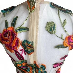 Step out in style with this elegant floral embroidered midi dress. The vibrant colors and intricate design make it a perfect choice for any event. Missing the lining