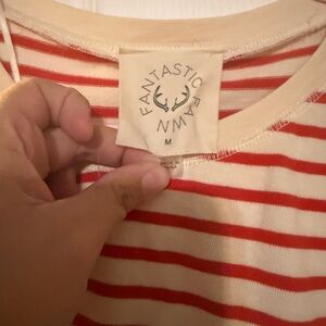 Red and white striped top with blue star accents. Short sleeves with blue and white stripes. Casual and stylish.