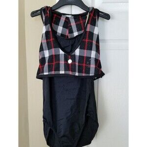 LIKE NEW! Only worn once for dance recital, black body suit, size CL, crop top, black, red and white, with hood, suze CL, white cargo pants, elastic waist, with pull string, zipper and button, but pockets in pants with ties.