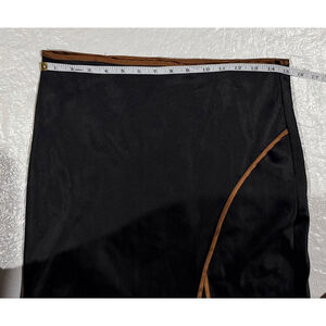 Alice in the Eve black midi skirt with an asymmetrical slit and contrast brown trim. Stretchy, sleek and flattering with refined Y2K and minimalist vibes — ideal for clean everyday looks or elevated styling.