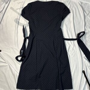 This is an Ann Taylor Loft dress in navy with embroidered dots, size 2 Petite. It features a V-neckline, short sleeves, and a calf- length shift style