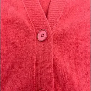 100% Cashmere Women’s Coral Cardigan. Small pockets on front. Ribbed bottom and sleeves. Metal buttons, with some paint chipped, show in last pictures. Has slight pilling.