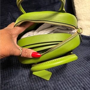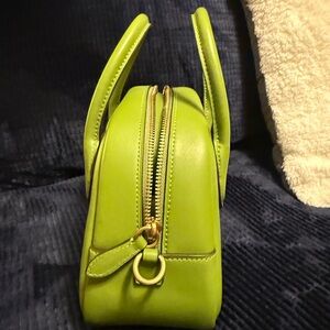 Stylish Coach bowling bag in a striking green hue. Perfect for adding a bold touch to your look. Features elegant design and quality craftsmanship. Additional strap for crossbody wear. See pics for small dent in leather from storage.