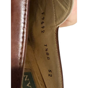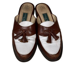 Pre-owned Cole Haan women's leather mules, size 7 1/2 AA. Brown and white two-tone design. Features a tassel detail. The leather shows signs of wear, including scuffs. The soles exhibit wear. Insoles are marked with F9692, 7 1/2. The shoes are in used condition, reflecting typical wear from prior use.