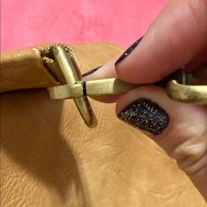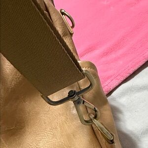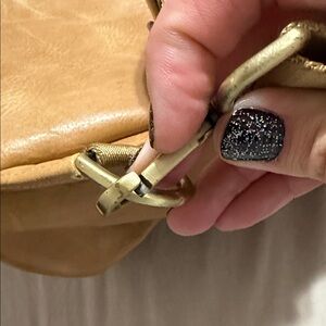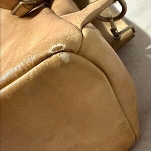 Tan leather backpack with tons of pockets. Can be used as a diaper bag or regular backpack. Slight wear on the bottom from normal use. The clips are a little loose but still function and could likely bereplaced (see photos)