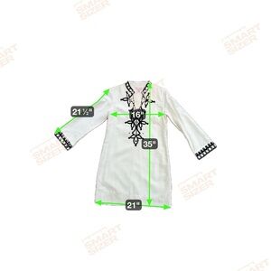 Elegant Lilly Pulitzer ivory tunic dress, size 8, featuring intricate black embroidery on the neckline, cuffs, and front bodice. The long-sleeve design and keyhole neckline give this piece a timeless, mod-inspired look — perfect for resort wear, cocktail parties, or elevated casual outings.