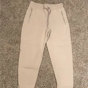 Bundle of comfortable and stylish jogger pants for women in cream, green, and navy. Perfect for everyday wear. Old Navy Active. All have two front zipper pockets. The cream ones have a tiny tear next to the zipper on the front right.