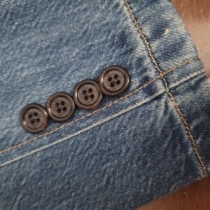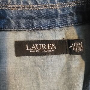 Lauren Ralph Lauren Lauren Petite single-button denim blazer in size 12 P. Traditional tailoring details include a notch collar, waist darts and princess seams, as well as functional pockets and button details on the sleeves. Signature engraved horn-effect buttons. Unlined.