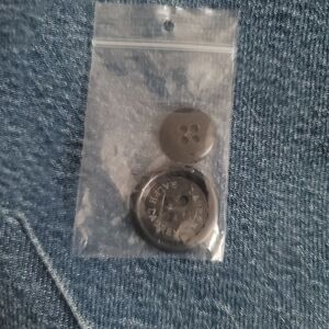 Comes with two spare buttons, one large and one small.